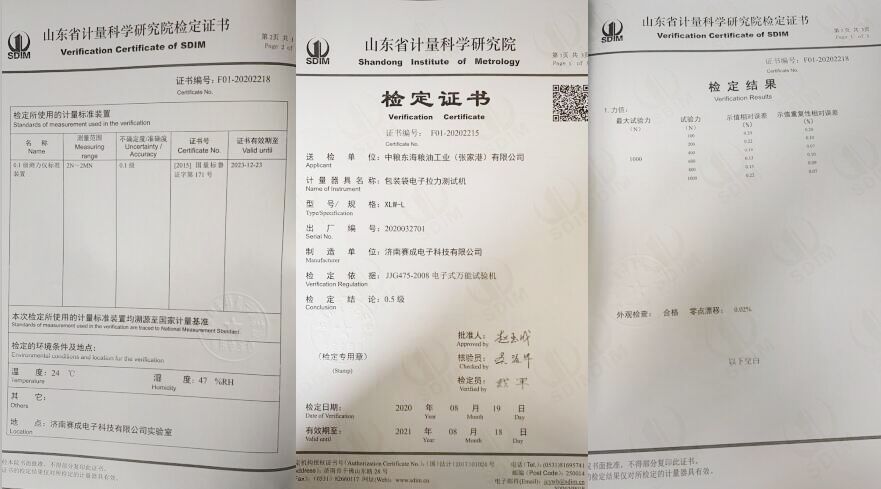 為了更好的交付這批設(shè)備,確保設(shè)備測試數(shù)據(jù)的準確性,濟南賽成儀器向山東省計量科學(xué)研究院提出了檢定申請。依據(jù)JJG475-2008電子式萬能試驗機的檢定規(guī)程,省計量院工作人員對XLW-L包裝袋電子拉力試驗機的精度和誤差等進行了檢定,經(jīng)檢定結(jié)論達到0.5級,檢定結(jié)果合格。2020年8月9日獲得山東省計量科學(xué)研究院頒發(fā)的檢定證書,獲得的這份檢定證書,進一步證明了濟南賽成儀器符合預(yù)定要求和質(zhì)量要求,測量結(jié)果準確,儀器持續(xù)可靠,性能穩(wěn)定。
